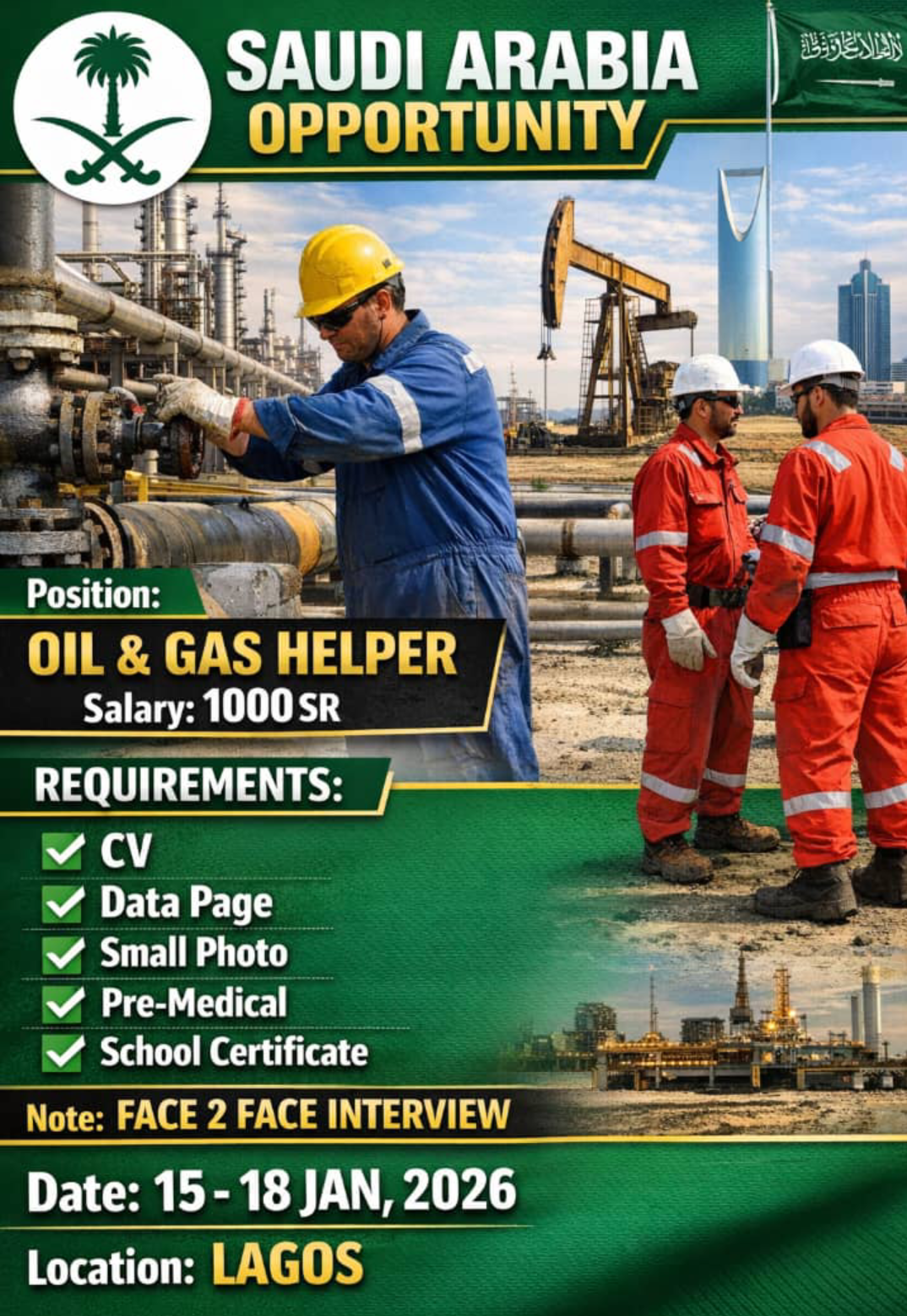 We are seeking physically fit and motivated individuals to join leading Oil & Gas projects in Saudi Arabia. As an Oil & Gas Helper, you will play a vital role in supporting on-site operations, assisting skilled technicians, and maintaining safety standards in a dynamic industrial environment.